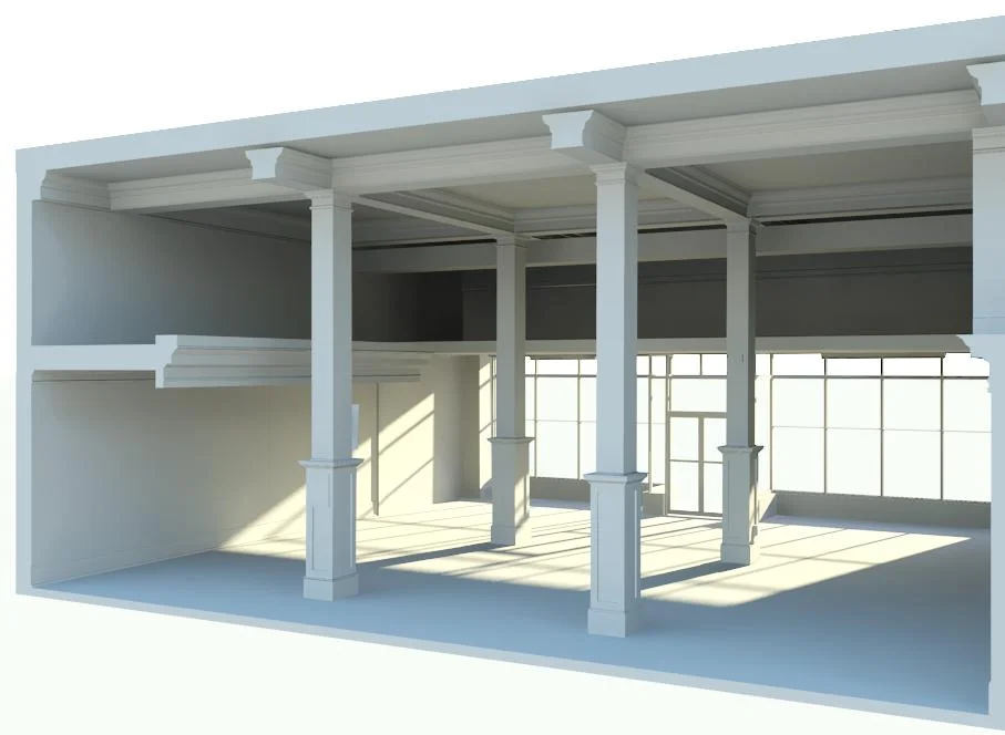 The existing building contains many historical and intricate details. Curved surfaces and historical mouldings prove to be very difficult and time consuming for a traditional measuring process. When using a scanner, many deficiencies are removed: multiple site visits, human error, dozens of photographs and hours of field measuring.